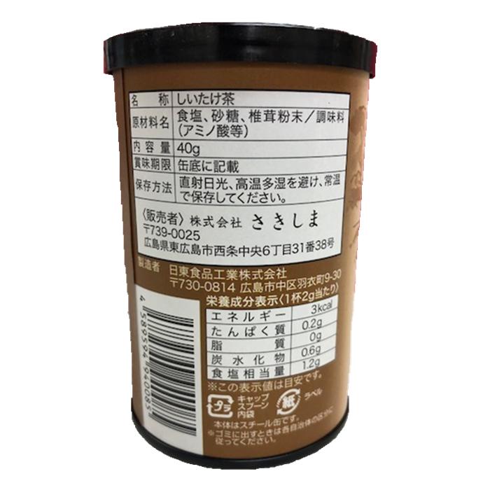 名称:しいたけ茶 原材料名:食塩、砂糖、椎茸粉末/調味料(アミノ酸等) 内容量:40g 保存方法:直射日光、高温多湿を避け、常温で保存 販売者:株式会社さきしま 〒739-0025 広島県東広島市西条中央6-31-38 104お湯に溶かして飲んだり、かき揚げやパスタやお吸い物などにも使えます!
